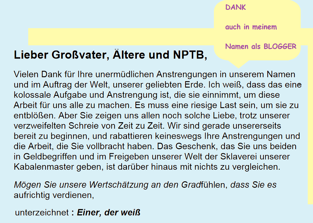 ADMIN CEJDA Wolfgang: Tel.: vormittag, wochent, 9-12 Uhr 0043 650740 7604. Themen schwer beweisbar. Erwartung: Friede, Prosperität, QFS ´Neues Finanzsystem`, RV / GCR, Social Projekt, INTEL - Deutsch (RPP/800er). Akzeptanz: österr. Gesetzeslage, Haftungs-Ausschlussfrage - DSGVO - geregelt. Fach-BLOG gehört Patrioten der Mitte, mit Spirit, Geopolitik, GESARA, Q, Qanon, liberal, wertfrei, ethisch, Musik, gesund, Essen. Übernehme keine Haftung für Linkinhalte Disclaimer